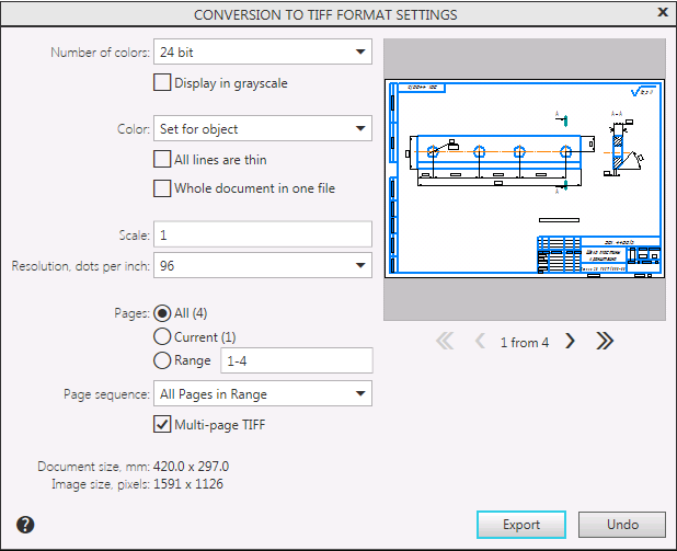 When saving in the TIFF format, the dialog contains the option Multi-page TIFF, which allows you to generate a multi-page file, with one document sheet on each page.