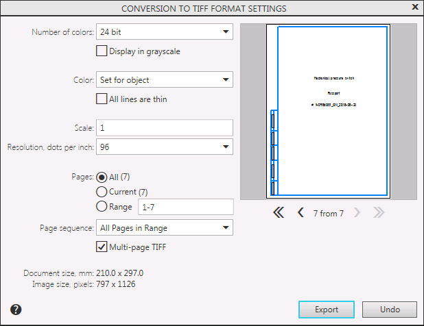 Parameters for writing to bitmap, EMF and PDF formats are configured in the corresponding dialogs. A brief description of dialogs for different types of documents is given in the following sections.
