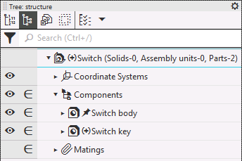 Signs showing the status of the object may appear between the icon and the name of the object. For example, a component may have a restriction attribute on editing, fixation, etc. After the object's state changes, the icon disappears or is replaced with another.