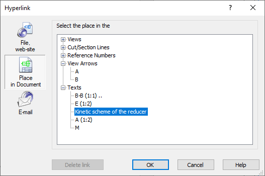 The dialog box displays groups of objects of the current document to which you can make a hyperlink. Groups can be expanded (collapsed) by clicking on the "plus/minus" icon to the left of the group name. By default, groups are shown in collapsed form.