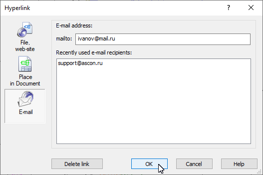 Enter the address in the mailto: field or select it by double-clicking it from the list in the central dialog box. This list contains the addresses used in the last session of KOMPAS-3D.
