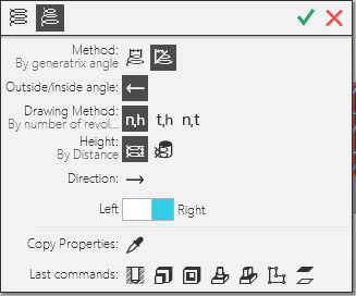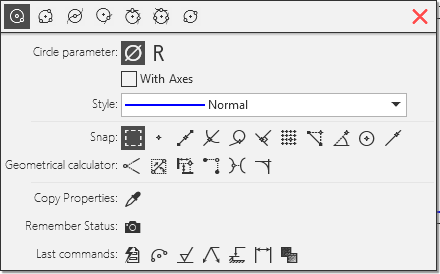 The context menus which are displayed while running commands include various controls over the creation of an object (buttons, on-off switches, lists, etc.), buttons to invoke the remaining commands of the group, the buttons for creation of an object and completion of a command, as well as buttons to invoke last used commands.