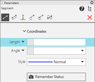 •If you need to set the segment slope angle first, and then its length, then before entering the first value press <PageDown> key. The highlighting will move from the Length field to the Angle field. Enter and accept the angle value. After that the Length field will be highlighted again. Enter and accept the length value.
