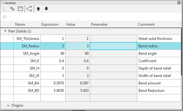 For example, the SM_Radius variable corresponds to the "radius" parameter in all bends of the part, and the SM_Angle variable corresponds to the "angle" parameter. Initial values of these variables are 3 and 90.