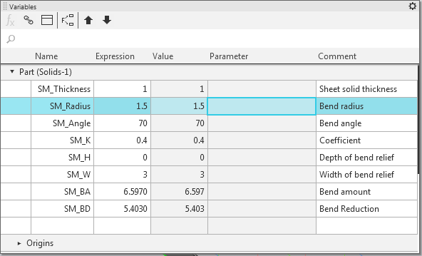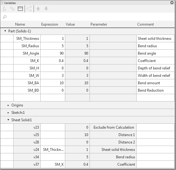 Variables of the sheet solid and their current values are displayed on the Variables bar: