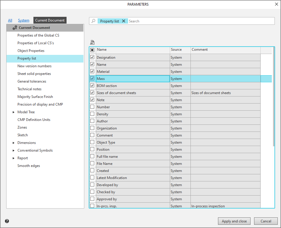 You can set up the properties list for the current document (drawing, fragment, part or assembly) in the Property List Settings dialog box.