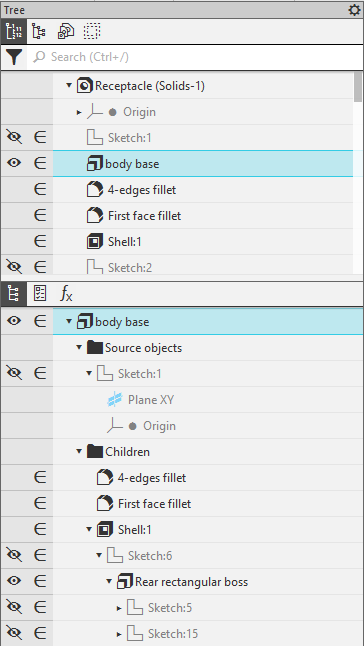 In the Source Objects section a list of the source objects is shown, and in the section Children – of the derived ones. The names of objects in the relations window coincide with their names in the Design Tree (if you entered new names of elements to replace the default names, they will be displayed in the relations window).