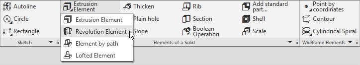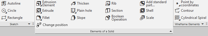 Commands for creation of objects of the same type are merged into groups. For example, groups make up commands for building segments, linear dimensions, bends in a sheet solid.
