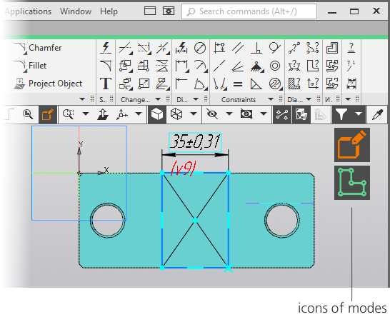 Icons of modes are used for informing the user of the current operating mode and way of exiting it. In fact, the icon of a mode – is an indicator which is displayed in the graphic region of a document while the system is switching to some mode or the other. Clicking a mouse on an icon means exiting a mode. After that, the icon disappears.
