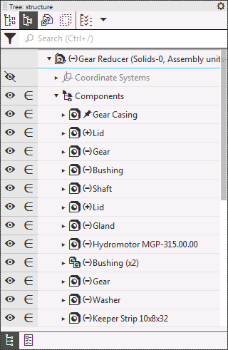 •Model Structure — display of the Build Tree with grouping of objects by types (see section Structural Representation of the Design Tree),