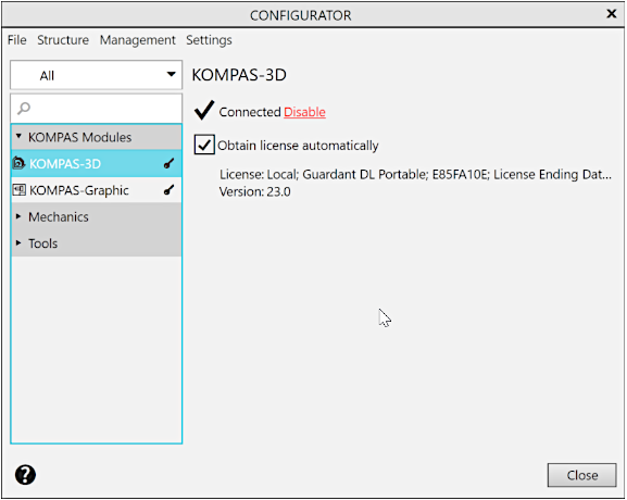 •Managing the connection of the module KOMPAS-3D and add-ons.