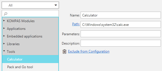 To include a component in the configuration, the commands of the Composition menu of the Configurator dialog box are used.