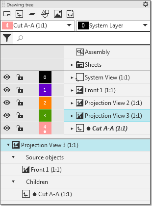 Model objects which do not participate in the formation of its image in a drawing – sketches, auxiliary axes and planes, LCS, etc. – are not displayed in the Drawing tree.