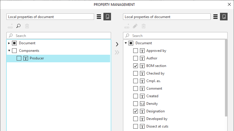 (in the example provided below, copying to the right is performed). The component property will be copied to the list of properties of the current document.