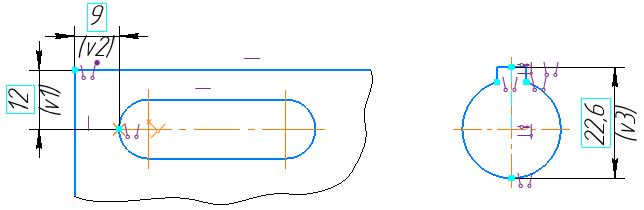 Therefore, if the end point of the center mark (or center grid) coincides with the middle of the curve, the following occurs when setting the dimension. The dimension will not be linked to the curve due to the Midpoint snap having secondary priority, and this dimension will also not be linked with the center mark/center grid, as it is not possible to establish associative dimensions for these objects. As a result, a non-associative dimension is created, although it is usually required that it be associated with the curve, i.e., control its size or position, as shown in the figures below.