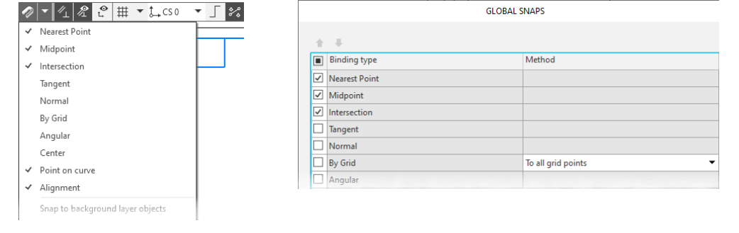 In the parametric mode, constraints arise automatically when triggered. Snaps. If the points to which snapping is possible coincide, then the snap with the higher priority is activated. Priority is determined by the order of snaps in the menu Snaps button and can be changed in the dialog box. Setting global snaps (see Figures).