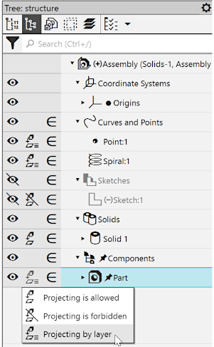 •Using the Projection column in the Design Tree of the model (see the figure above) – click the icon in this column and select the required item from the list that appears: