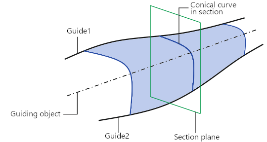Surface of the conical section is formed by moving the section — conical curve — in space. Thus, in each position of the sections, its plane is perpendicular to the specified guiding object, and the ends of the conical curve rest on the selected guides.
