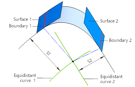 The method By offsets from sides implies that during the construction, in each position of the section, there are points closest to the intersection point of the curves, equidistant from the intersection curve of the section plane and the specified surfaces. The position of the equidistant curve is determined by the magnitude of the displacement from the specified surface (S1 and S2 respectively).