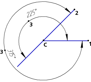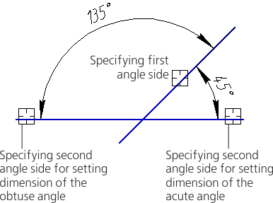Dimension is set to an angle larger than 180°. This option may only be selected manually. Please, note that there are two angles that are larger than 180° between the two sides: •angle that complements the acute angle between the sides to 360°, •angle that complements the obtuse angle between the sides to 360°. To select the required option, specify the point that will determine dimensional line location. |