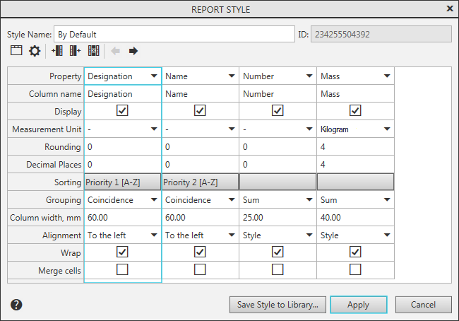 The set of columns in the dialog depends on the selected style. For the By Default style, the dialog contains columns with Designation, Name, Quantity, and Mass properties, while for the By all properties style — all local document properties.