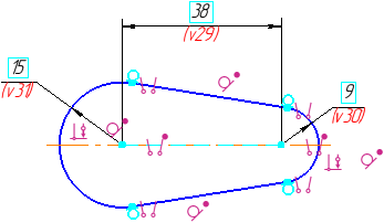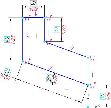 The constructions described in the examples are performed in parametric mode. Objects are built arbitrarily indicating the starting and ending points. The parameters of the objects – the length and angle of inclination of the segments, the radii of the arcs – are determined by dimensioning.