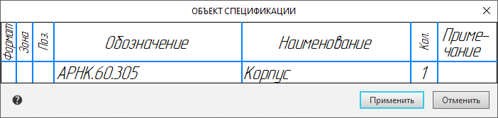 The BOM object window (see figure) containing a fragment of the BOM table: the table header and one row, appears on the screen. The table corresponds to the BOM style included in the current BOM description.