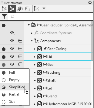 The list of objects in the Document Tree is represented as a table. The first few columns contain fields that display the various properties of the document objects. The current property value is displayed in the field in the form of an icon. A mouse click in the field changes the value to the reverse (if there are two values) or expands a list of values, see the figure. Therefore, it is possible to quickly hide and show objects (in the Tree of a drawing or model), change the load mode (in the Assembly tree), change the format of sheets (in the Tree of a drawing or text document) and so on.