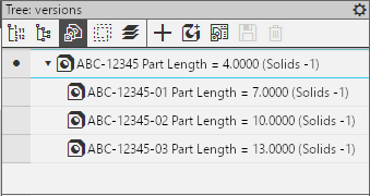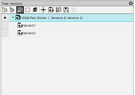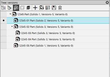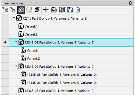 button pressed. In this case, the title of the toolbar displays the name Tree: versions. Depending on the presence of executions and variants in the model file, the Tree can contain only versions (Figure 1), only variants (Figure 2), or both executions and variants simultaneously (Figure 3). In the top part of the Tree toolbar, there are buttons that allow you to perform various actions with versions and variants.