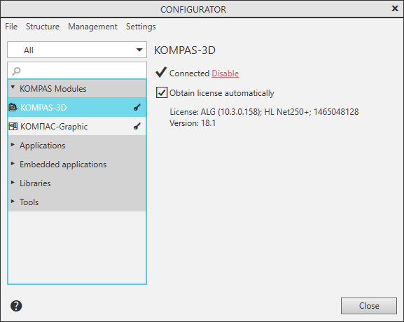 For the module KOMPAS-3D and applications. The element controls the connection of a component, i.e. obtaining a license for it: if the component is connected, the license for it is busy, and if it is disconnected or suspended, it is free. •The KOMPAS-3D module can be in the state of Connected or Disconnected. In the first case, the configurator shows the icon •The application can be in the state Connected, Disconnected or Paused. If the add-on is connected, the configurator displays the icon |