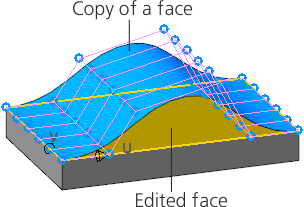 After you edit the copy of a face, its borders may not match with the borders of the source face and may be located in such a way that it would be impossible to connect adjacent faces of the part. In this case, when you return to editing the face, its shape and position will be different from the current shape and position of the copy. The face will remain in its original state and the phantom of the grid will keep the current state. |