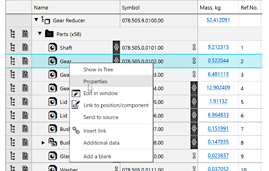 •Show in Tree – (only for parts) allows you to find the part in the Model Tree. The object for which the command was run is highlighted in the Tree. If necessary, it expands the desired section of the Tree and scrolls automatically to make the highlighted row visible.