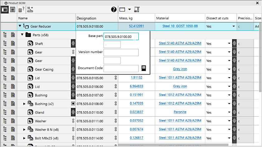 Note that certain properties cannot be edited on the Product Composition Panel — the corresponding cells have a gray background (see illustration). For example, the value of the property Accuracy Class cannot be set in the Product Composition Panel for either the product itself or its constituent parts (the selection of the accuracy class is done in general tolerances setup dialogThe property Quantity can be assigned only to assemblies, but not to the product, while the property Author, on the contrary, can be assigned only to the product, but not to assemblies.