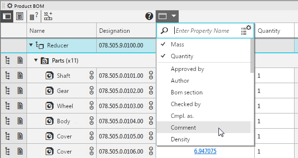 . The list of properties available in the current model will appear. The properties that are already displayed in the Product Composition Panel have a check mark and are located on top of the list. These are followed, after a separator, by properties not displayed in the table. To enable/disable display of a property, click it.