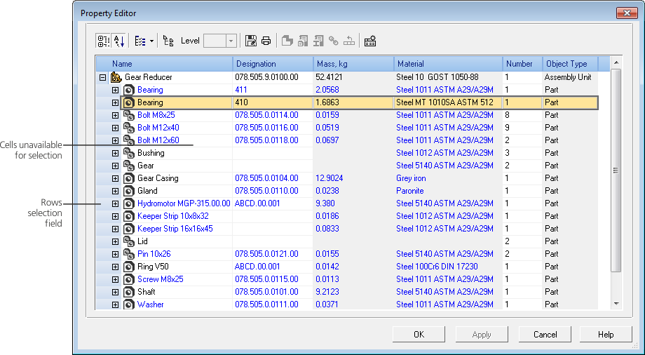 In the dialog box, objects and their properties are displayed as a table. Controls of the dialog box allow you to manage properties display in the Editor and to perform various actions with them.