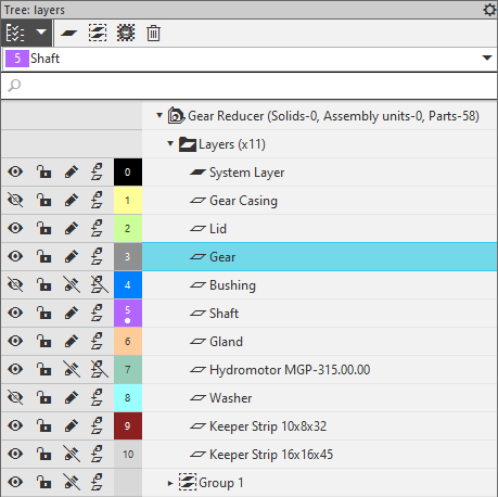 The Layer panel is used to work with layers of the model document. and layers of sketch. To turn on/off the display of the Layer panel, call the command Setting — Panels — Layers