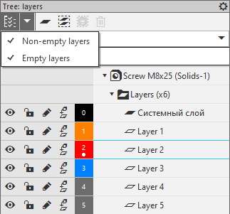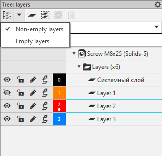 The icon of a non-empty layer in the Layer panel is black. The icon of an empty layer differs from the icon of a layer with objects and is a gray outline. The display of non-empty and empty layers in the Panel can be controlled. To do this, use the button Tree structure