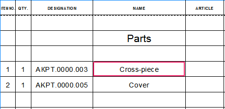 The Designation and Name property cells that are not linked to the source are highlighted with a red marquee in the BOM table to distinguish them from property cells with a link. The marquee is displayed when working with BOM items in the subordinate modeas well as when working in a BOM document to which an assembly or an assembly drawing is connected.