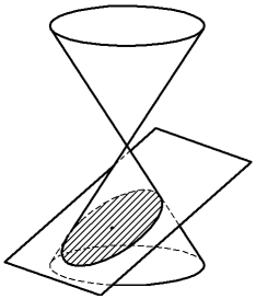 •The cutting plane intersects all generating lines of the cone at the points of a single cavity; the intersection line is a closed curve — ellipse (figure a). A circle as a particular case of an ellipse is obtained when the cutting plane is perpendicular to the axis of the cone. If the plane passes through the vertex of the cone, without intersecting any of its cavities, the circle transforms into a point.