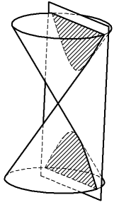 •The cutting plane intersects both cavities of the cone; the line of intersection — the hyperbola — consists of two non-closed parts (branches of the hyperbola) extending into infinity, lying on both cavities of the cone (see figure b). If the cutting plane passes through the axis of the cone, the hyperbola transforms into two intersecting straight lines.