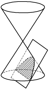 •The cutting plane is parallel to one of the generating lines of the cone; the section will have an open curve that goes to infinity — a parabola, lying entirely within one cavity of the cone (Figure b). If the plane touches the surface of the cone along the generatrix, the parabola transforms into two coincident straight lines.