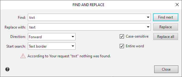 If the entered text is not found, a message about this is displayed in the dialog. |