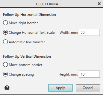 Allows you to specify the height of the row and the width of the column that contain the selected cell, as well as the "behavior" of the table when entering text into this cell. If a range of cells is selected, you cannot enter the row height and the column width.