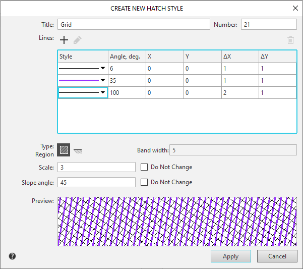 To finish creating/editing the hatch style, click OK. Click Cancel to discard all styles and close the dialog box.