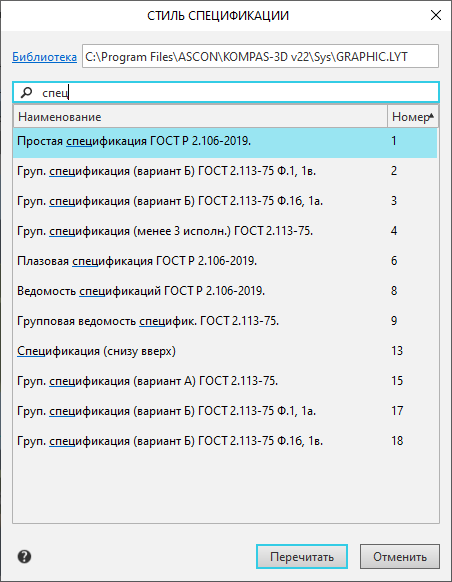 Allows selecting a library file *.lyt, and from it — either a title block for inclusion in detailing, or detailing for a sheet, or style for BOM. In some cases, the *.lyt library is already defined, and then in the dialog, only the selection of detailing/design/style/title block from this library is performed.
