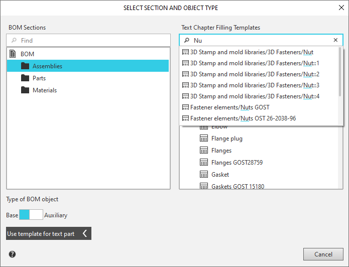 Click this link to select template for the text part of the BOM item. In the dialog, an additional area with the list of templates will appear. The list will be displayed if a section in which compound sorting is performed is selected (for example, the Stock products section or Materials section); otherwise, there will be no template list. The search field is located above the template list. Enter the desired characters in it, and then select the required row from the appearing list of search results. To close the template selection area, click the link Use template for text part again. If a template is not selected, the text part of the object created in the section with composite sorting can be entered into the BOM table cell using the keyboard. The entered text will be automatically converted into write, i.e. divided into fields and sorted by these fields. For more details on Template text as a line... The reference Use template for text part is missing in the dialog if it is invoked to set/change the property BOM section of the object. |