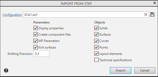 Press this button to save the import settings configured in this dialog to a configuration file. A configuration file for import to STEP format (for all variants) has the extension .sikf. |