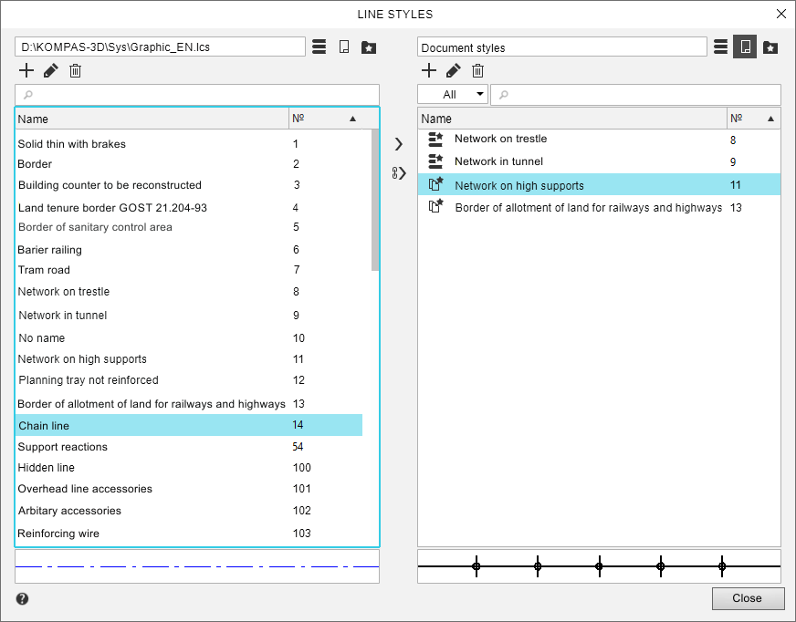 This button allows you to exchange styles between libraries, sets, and documents. After clicking it, the selected style(s) are copied to the adjacent representation and added to the list as a library style. Library styles maintain a link to the library files from which they were added to the list. The button is available if there are selected styles in the list of library styles or styles from a set. |