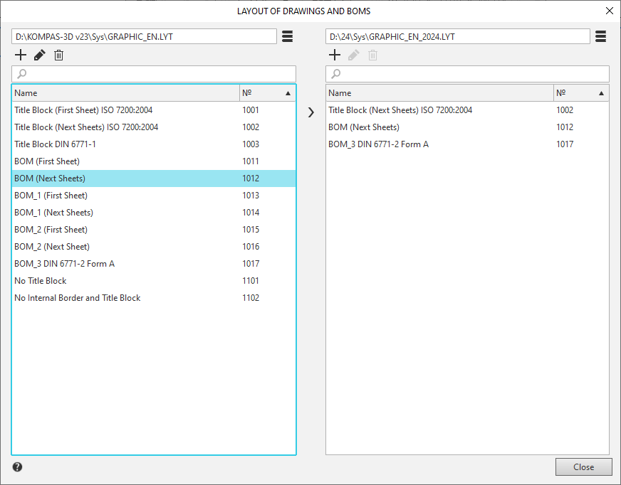 Buttons allow you to share layouts between different libraries. To do this, open the necessary libraries, select an item and click the copy button. When copying a detailing from one library to another, the title block used in the detailing is also copied to this library. |
