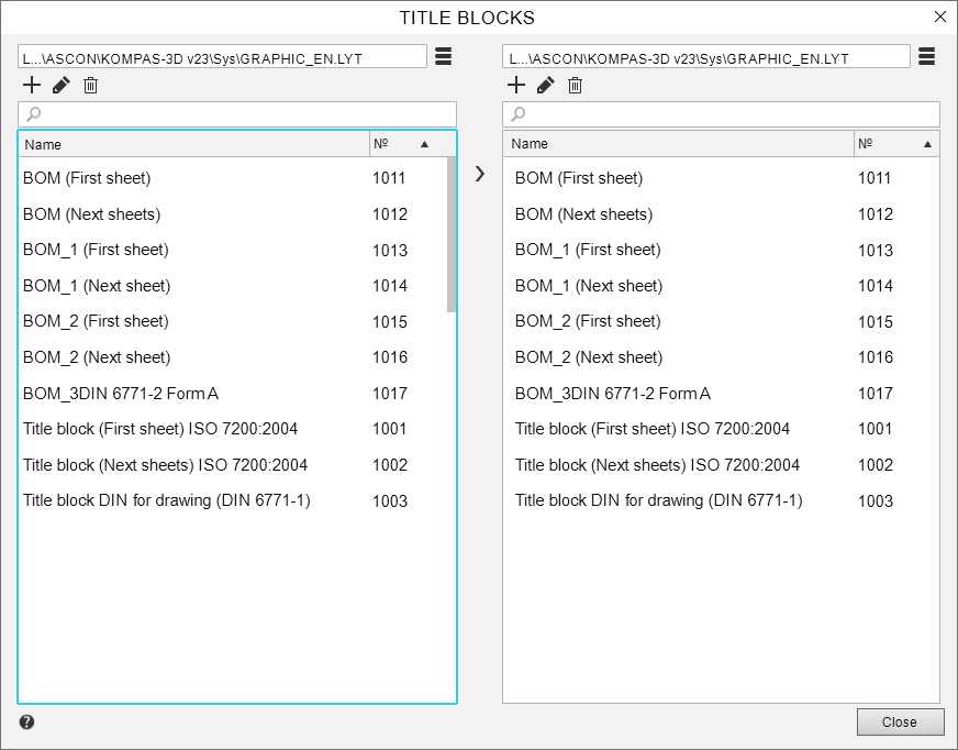 The buttons allow you to share title blocks between different libraries. To do this, open the desired libraries, select the element, and click the Copy button. |